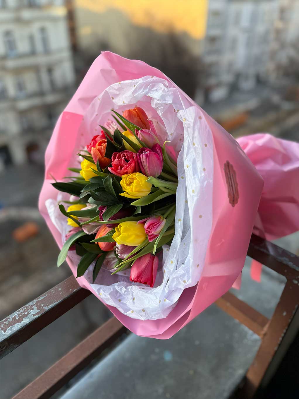 The composition pairs the soft texture of premium tulips with the deep green of Ruscus foliage, creating a voluminous and cheerful look. Wrapped in designer pink paper, it is a bright choice for anyone looking to send a smile.